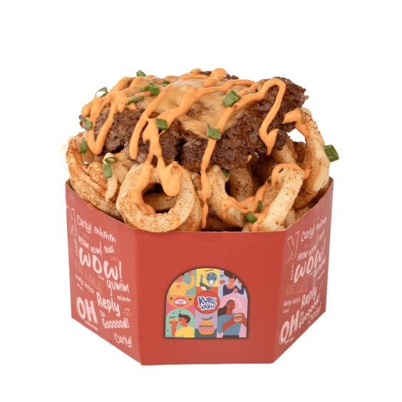 Crispy Kurly fries topped with juicy beef patty pieces, sweet caramelized onions, and a generous