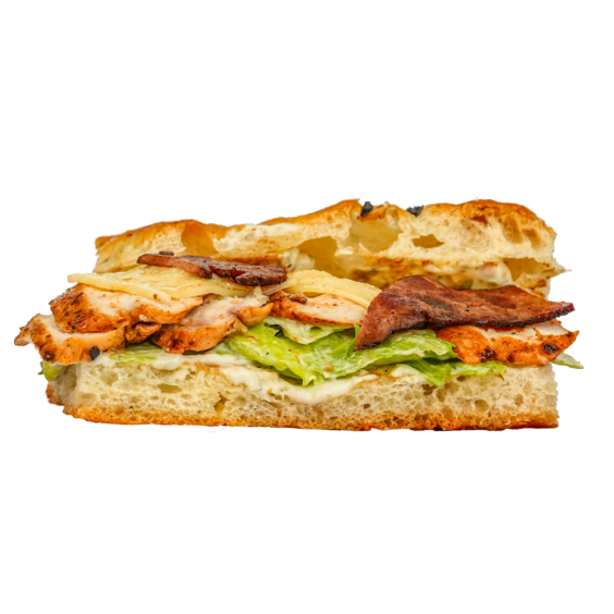 Tender chicken fillet, crispy Turkey bacon, and fresh romaine lettuce tossed in creamy Cesar caper dressing, layered with melted cheese and served on warm, toasted focaccia bread.